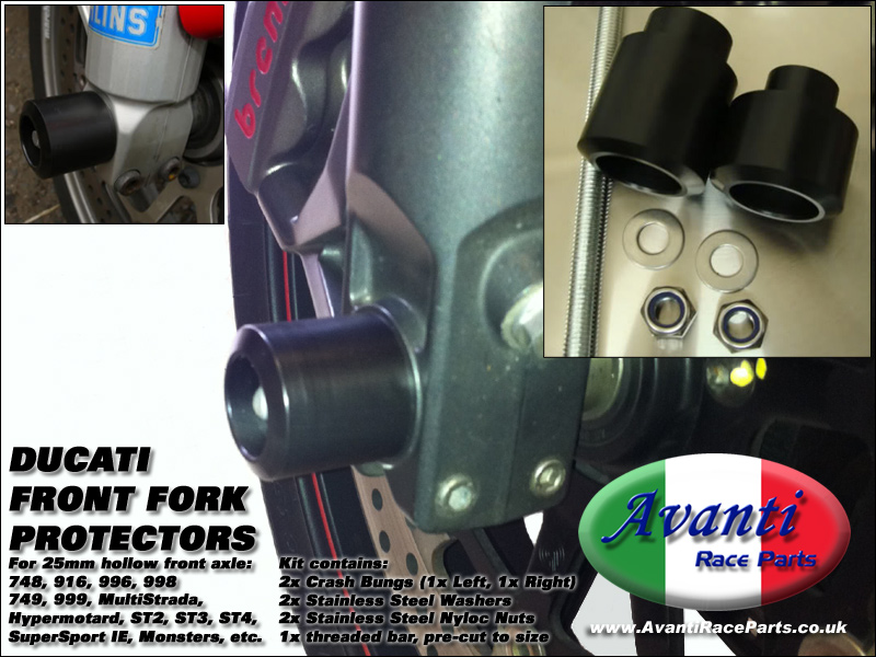 | Ducati front fork crash bungs. These simple crash bungs could save you thousands in the event of a crash! Simple to fit, these crash bungs are made from Acetal, an extremely strong plastic with high abrasion resistance. Suitable for any 25mm hollow front axle, including: 748, 916, 996, 998, 749, 999, Hypermotard, Monsters, Supersport, ST2, ST3, ST4, MultiStrada, Sport Classic, etc. Please check your front axle to ensure compatibility. |