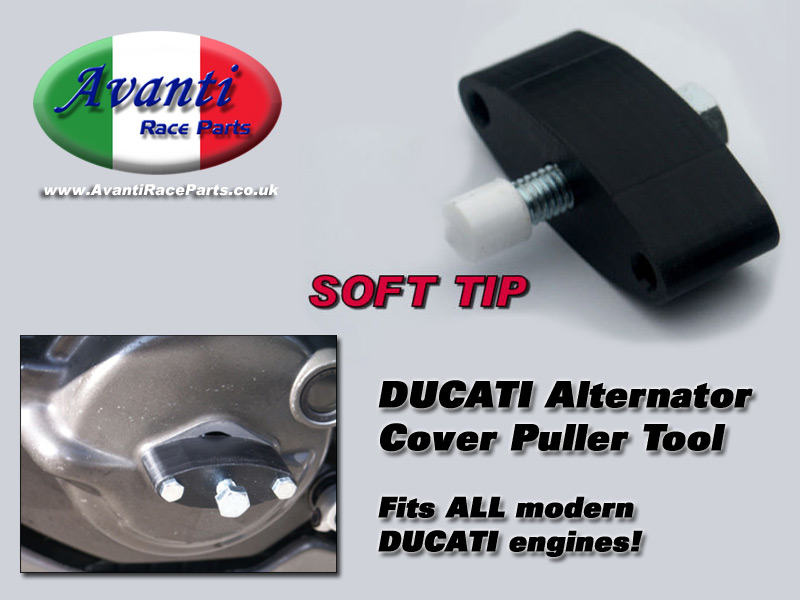 | This alternator cover tool does exactly what it says - it allows you to easily remove the alternator cover without damaging your engine! Simply remove the small cover and bolt the tool in place with the bolts provided. You then wind in the centre bolt and the cover is removed! The centre bolt has a soft tip to ensure it will not mark your engine.