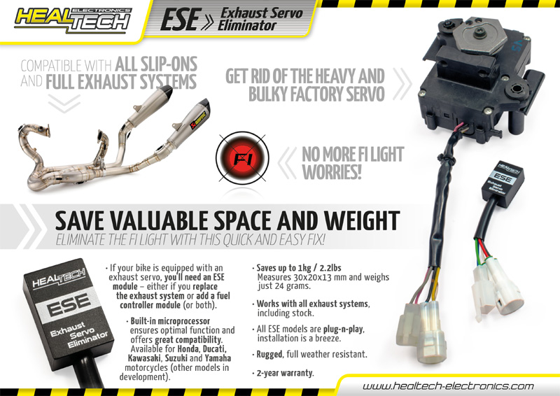 | The Healtech Exhaust Servo Eliminator (ESE) allows you to remove the bulky exhaust servo mechanism and remove dashboard error lights. A simple plug-and-play module that uses a micro-processor for optimal functionality. Works with all exhaust systems including stock systems.